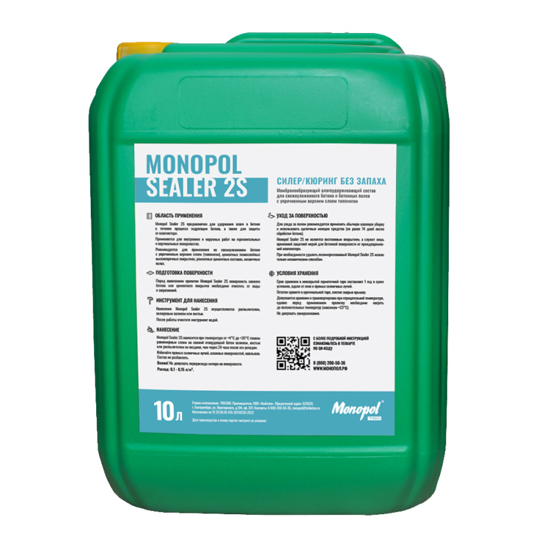 Monopol Sealer 2S - силер/кюринг без запаха, мембранообразующий влагоудерживающий состав для свежеуложенного бетона и бетонных полов с упрочненным верхним слоем топпингом. В результате нанесения образует тонкую, износостойкую пленку, которая эффективно защищает свежий бетон от преждевременной потери влаги во время гидратации бетонного основания. Идеально подходит для защиты бетона при устройстве пола с упрочненным верхним слоем помощью сухих смесей Monopol TOP и сухих упрочняющих смесей других производителей. Готовый к применению состав.