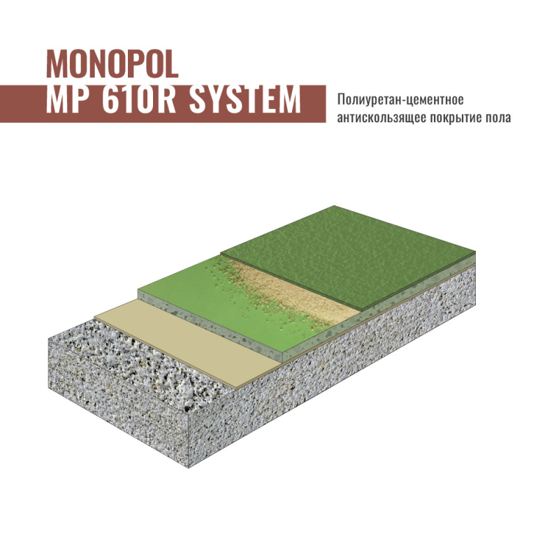 Полиуретан-цементное наливное толстослойное среднетекстурированное покрытие пола. Толщина от 6 до 10 мм.