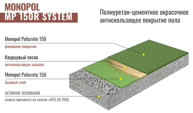 Материалы входящие в систему: Monopol Policrete 100, Monopol Policrete 610 засыпка кварцевым песком, финиш Policrete 150, Monopol Policrete 420 (опционально)